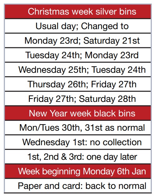 Christmas week is when silver bins will be collected. Those due on Monday 23rd December will have their bins emptied on Saturday 21st December. Collections for Tuesday 24th and Wednesday 25th will both take place one day earlier than usual.